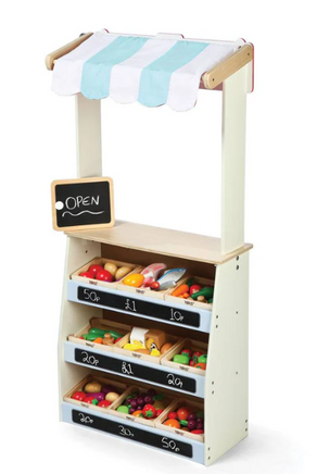 The Tidlo Play Shop and Theatre is a versatile product, offering both theatrical and market-playing opportunities in one convenient design. With just a quick turn of the rotating dial, the theatre curtain can be raised, revealing a market stall roof. Additionally, the theatre includes a chalkboard and clock for promoting the next play and its start time. The package also includes 50 theatre tickets that can be dispensed through the ticket machine slot to give to audience members. During the performance, shelves are available for storing puppets and props. The market stall area of the shop features three shelves to hold Tidlo Food Crates (sold separately) and a removable chalk panel for attaching to the side. Switching between the theatre and shop is simple enough for children to do on their own, making it a great tool for developing storytelling skills, confidence, vocabulary, and emotional understanding. It also promotes hand-eye coordination, fine motor skills, and dexterity. Adult assembly is required. Made from responsibly sourced materials