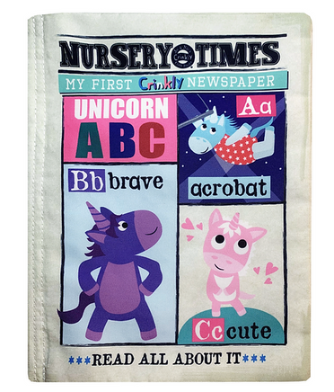Nursery Times Crinkly Newspaper. Counting to 10 and countdown from 10 - 1 in Space. 6 pages of Space themed illustrations. Dimensions approx: 30cm x 20cm. CE tested and machine washable. A practical, lightweight cloth book with crinkly pages. A great sensory toy. A unique gift. Each newspaper is packed in a gifting envelope to add 'To' and 'From' and a short message.