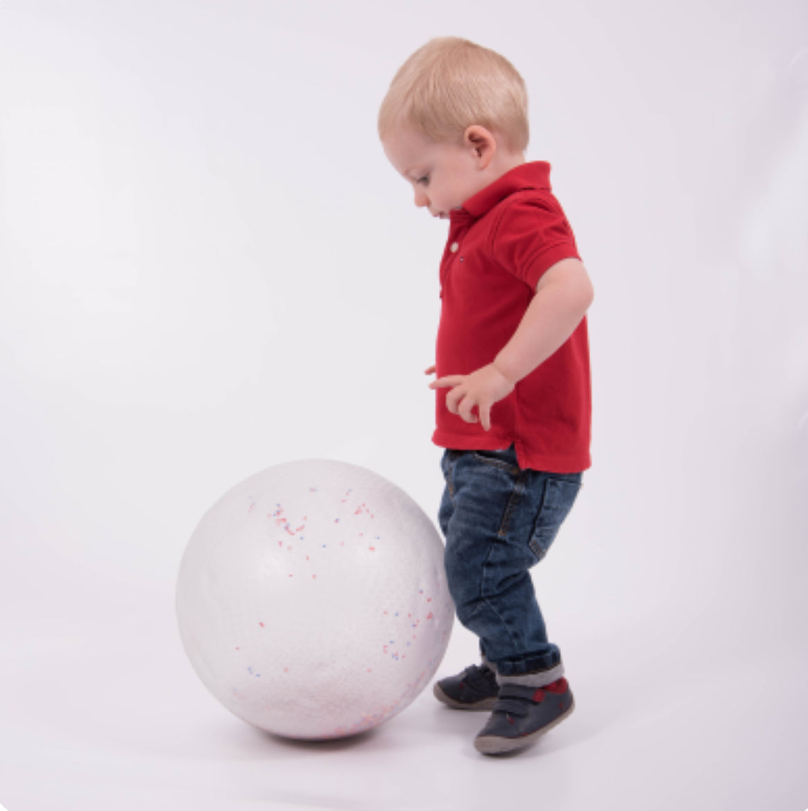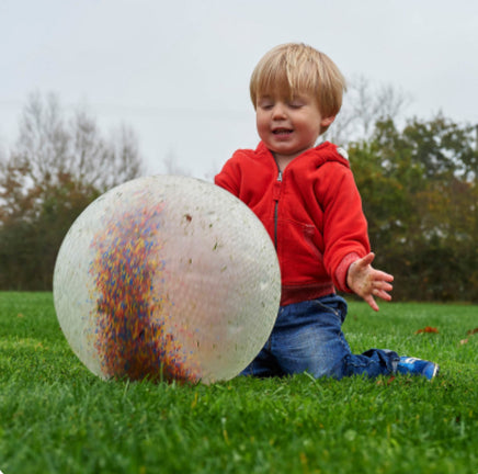 A large clear inflatable ball with a subtle textured surface, containing thousands of tiny colourful plastic beads which rattle and dance as the ball is pushed and rolled about. Ideal for gentle, controlled physical play where children can roll or pass the ball to each other.