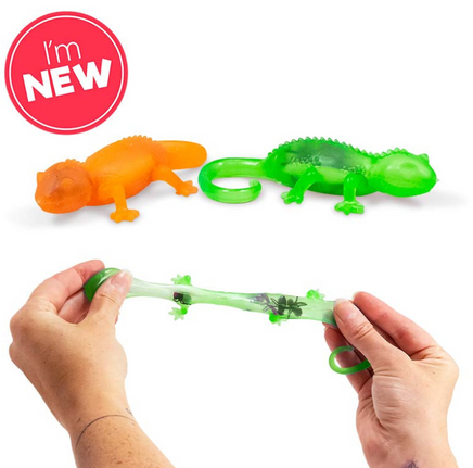 Stretch and squeeze this gruesome lizard critter to see the yucky worms and spiders inside! Available in orange and green colours.