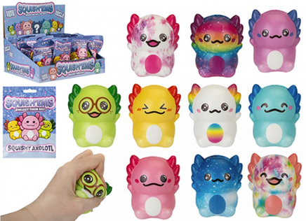 Discover the 8cm Squishy Squad Axolotl in Blind Bags . 10 assorted colourful designs perfect for collectors! These squishy, soft, and stress-relieving toys offer a fun tactile experience. Ideal for retail or promotional giveaways, each axolotl comes in a mystery blind bag, adding excitement to every purchase.