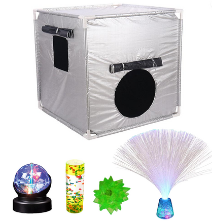 Ideal for exploring accessories that light up, glow in the dark or project, perfect for creating a calming environment with soothing mood lighting, or evoke their excitement with colour changing, interacting sparkle. or simply stimulate their other senses in this dark room with our textured or scented bags.