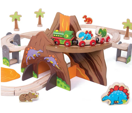 - Includes wooden tracks, a dinosaur railway engine and two carriages, volcano tunnels, a group of wooden dinosaurs and trees