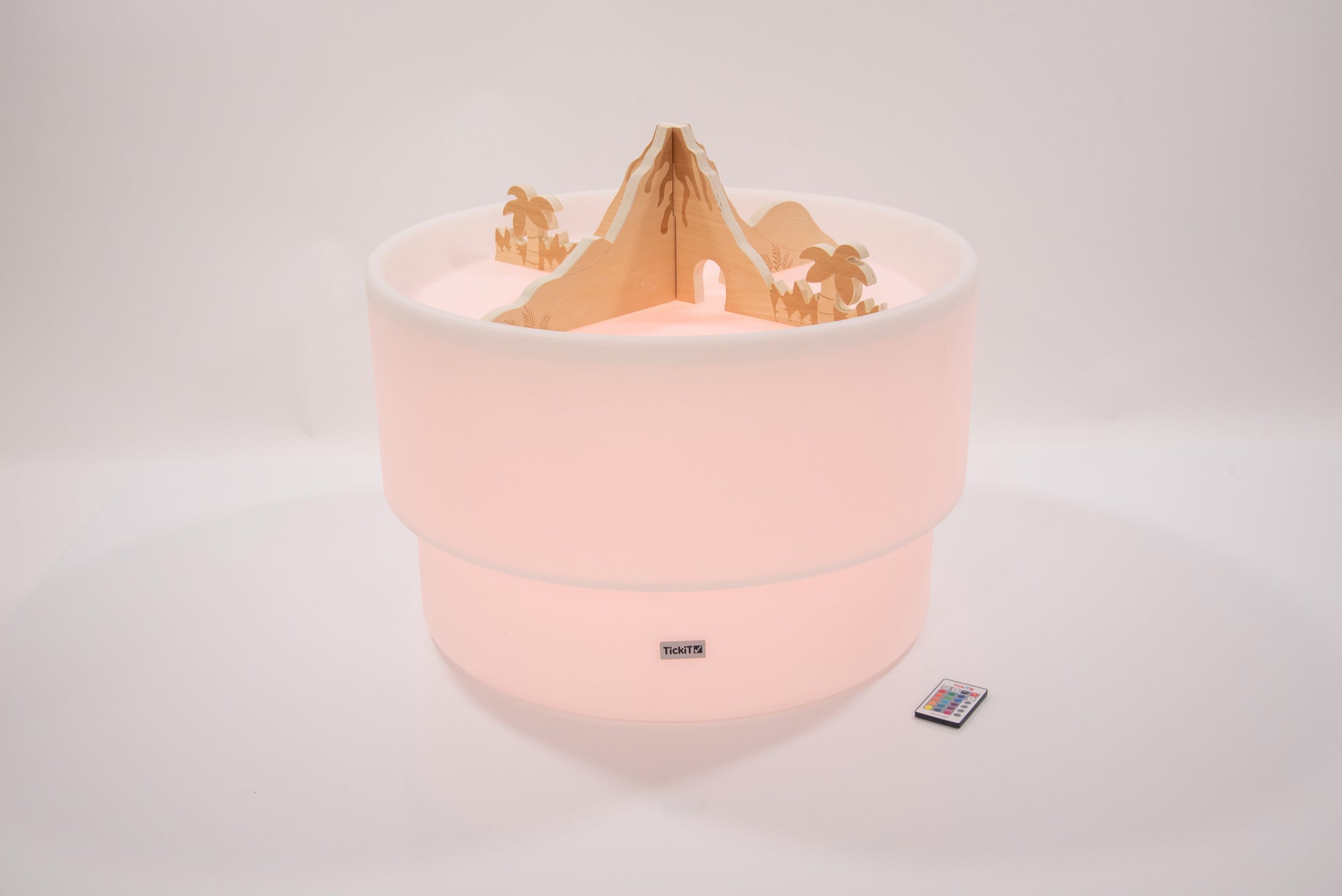 The light-up table has a raised edge to contain the play mat and wooden 4-way dividers, creating an inviting area for imaginative play.