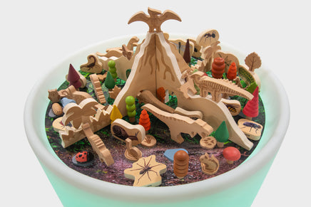 The mat is semi-translucent, so changing the light colour will illuminate the forest features in a range of ways. With lasered detailing on the dividers and wooden dinosaur blocks, tactile woodland trees and trail sets, and double-sided minibeast picture blocks, the scene is set for creative play, encouraging descriptive language, developing motor skills and learning about the history of our world.