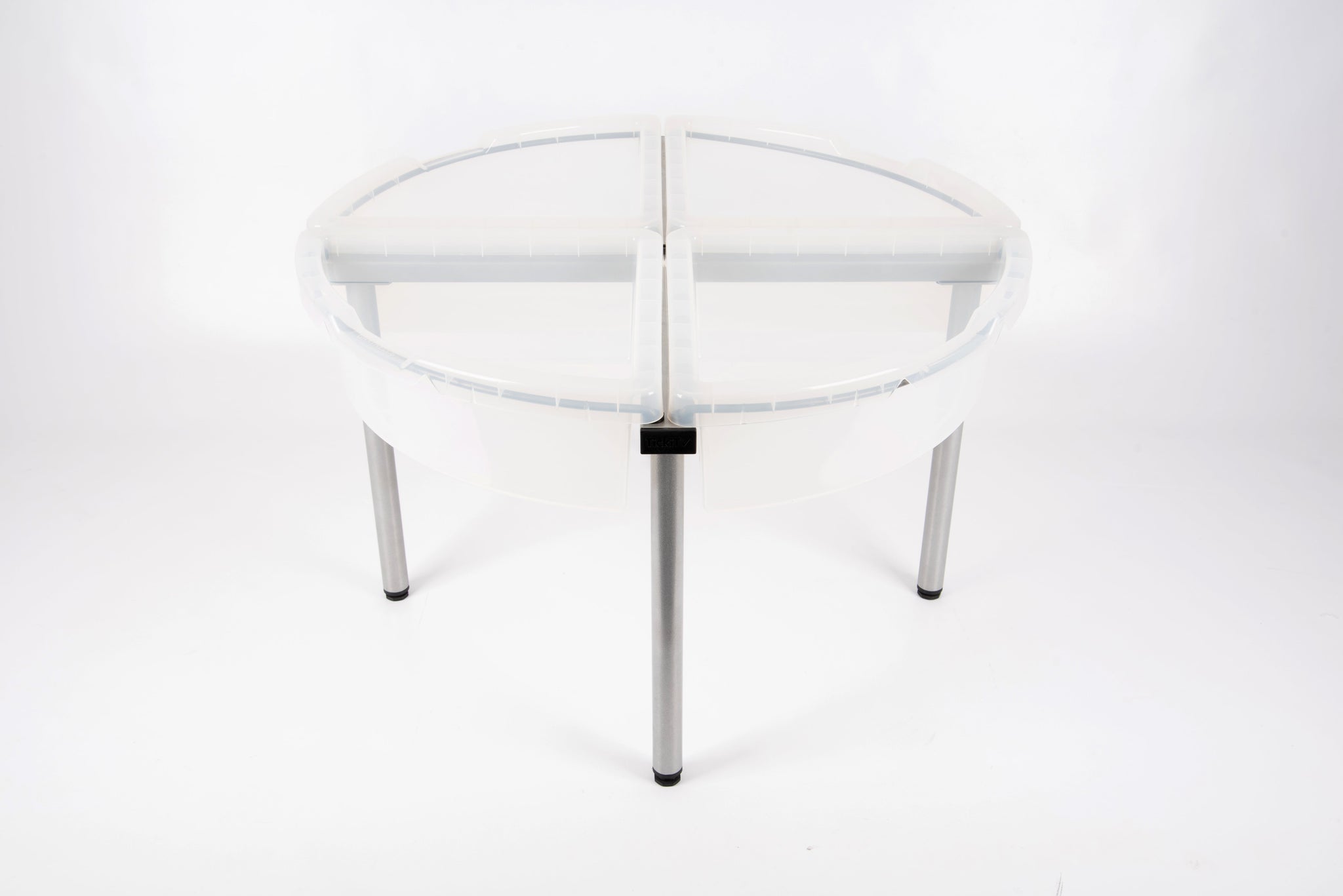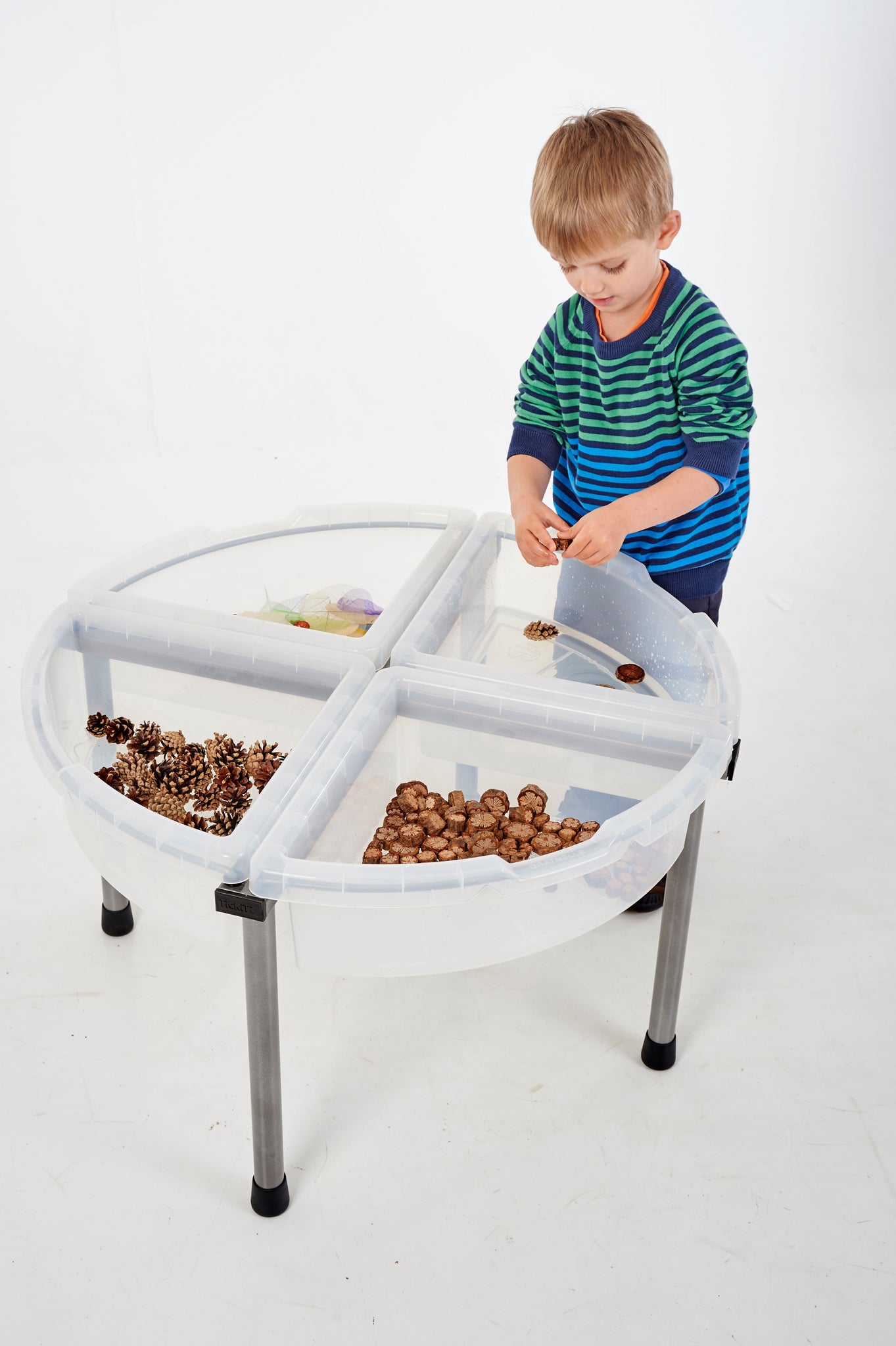 4 clear quadrant trays with a grey metal stand forming a sturdy activity circle. The legs have micro-adjusters in the feet for use on uneven surfaces. Children can play and discover the properties of sand, water, confetti, wood chippings or whatever medium you decide to place into the handy sized trays which are easy to manage, clean, lift and empty. Ideal for encouraging collaborative group play.