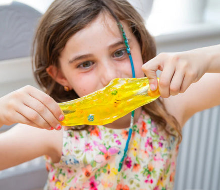 Get ready for some bee-autiful fun! This beehive-shaped pot is filled with glorious golden, honey-like slime, perfect for squishing and stretching. It comes with adorable bumblebee, honeycomb, and blue flower charms to mix in, adding extra play value to this sweet and sticky adventure!