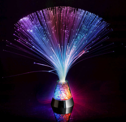 Striking blue light passes through the nylon fronds to create a galaxy of tiny stars that will lazily drift with a slight breeze. The base contains a collection of transparent crystal-like pieces that refract a pulse of changing light to complement the fibre optic effect above. A very pretty version of a kitsch classic.