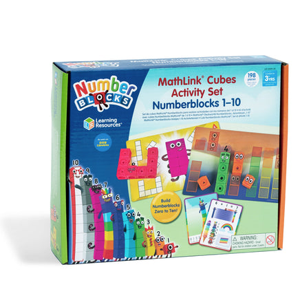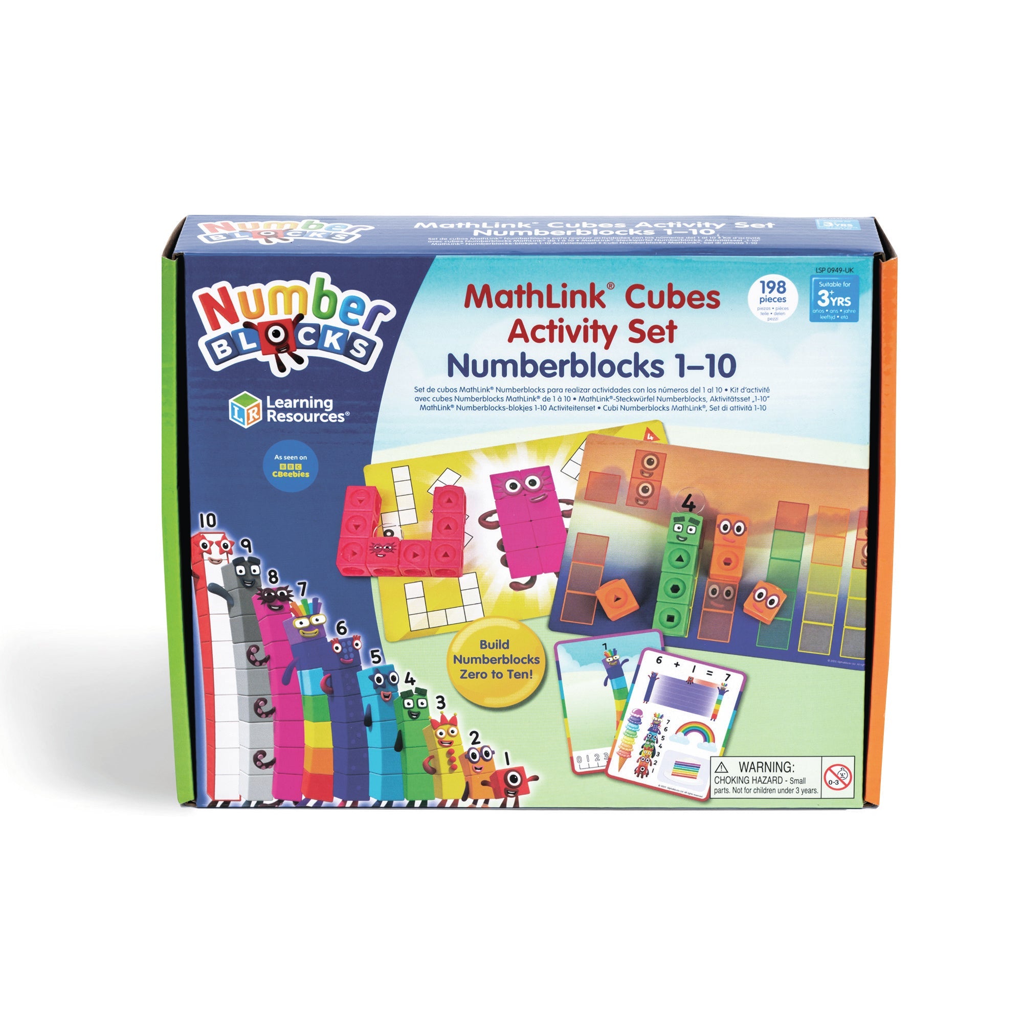 • The set includes 155 Numberblocks MathLink Cubes, 50 faceplates, 43 stickers, 10 Numberlings, 10 Character Cards, 15 double-sided write-and-wipe Activity Cards, Fourteen’s Skateboard and Helmet, Twenty’s Top Hat, and a multilingual Supporting Activity Guide.