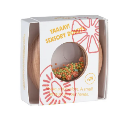 Our new sensory toys will delight little ones. These smooth wooden rattles in the shape of a donut, are perfect for little hands to grip comfortably. Inside, you can identify yummy fruits and vegetables shapes, which, when shaken, unleash an irresistible sensory sound.Made of natural beech wood, our delicious donuts are bite-proof, are free of toxins, and designed to delight, promoting healthy eating from the earliest age. Why not collect them all!