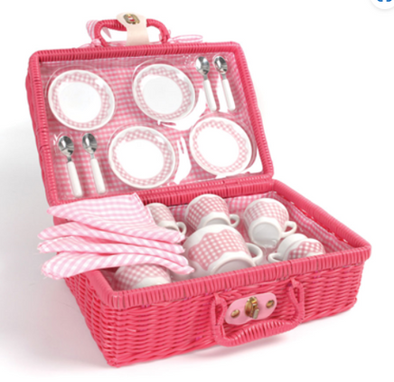 Host a luxurious tea party for your teddies and dolls with this delightfully pink Picnic Tea Set. A traditional tea set, it features four porcelain plates, cups and spoons, a milk jug, teapot, sugar pot, napkins and a small blanket; complete with a wicker-effect hamper that features a carry handle and lockable strap. The ideal travel companion. A great way to encourage creative and imaginative role play. Develops hand/eye coordination, fine motor skills and dexterity. Conforms to current European safety standards.