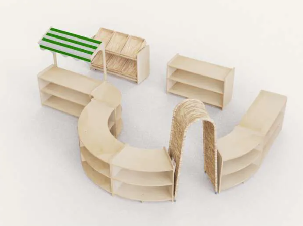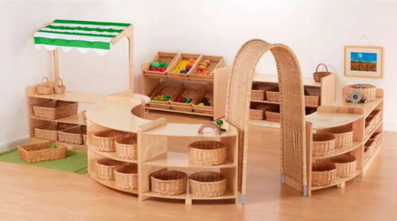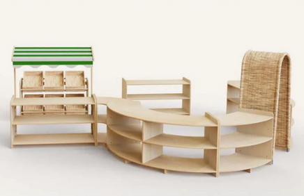 The Rookie Open Range Set Up - 10 Piece Set is a versatile set of ten pieces from our Rookie Furniture Range that can be creatively arranged to enhance any play or learning environment. It includes a wicker doorway, three open shelving units, two curved shelving units, one large curved shelving unit, one mobile basket shelf, a Padstow basket set, and a canopy.