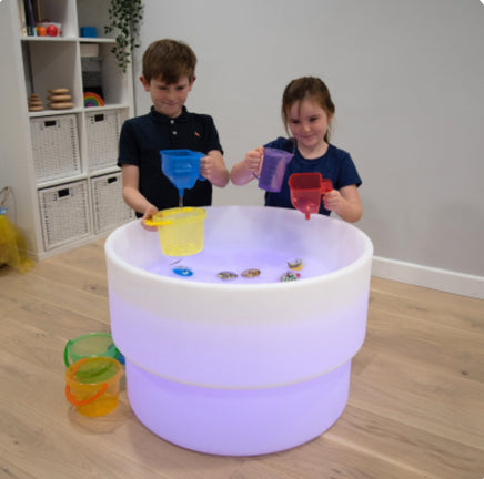 Our new colour-changing sand & water table brings a whole new perspective to water exploration and sensory discovery. Providing a soft light which changes colour using the remote control, the shallow well can be used for water, sand, jelly, foam or translucent objects for a wide variety of ways to explore using light and colour.