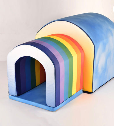 Comprises: Two tunnels 1 x large 800 x 800 x 800: 1 x medium 600 x 600 x 600. 2 x bolsters 600mm x 100mm 1 x pad 600mm sq x 40mm thick. 2 x sets of entry cover flaps. Also features: sewn in under the large tunnel are mirrors, plus a pocket for iPad/tablet. Also included a pack of 4 “velcro attached” interactive play disks. Additionally, integrated hanging loops are fitted to both tunnels to hold & display own sensory materials, plus the set also includes 3 lengths of decorative crinkly net.