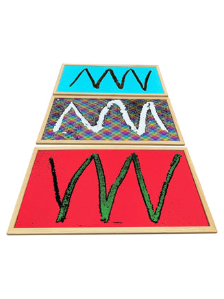 Set of 3 Sequin Wall Boards. Sweep, Stroke or Draw across the board to make beautiful two colour patterns. The wall boards are perfect for sensory play and promoting fine motor development. Set in Natural wood and comes in 3 colours. Perfect for any sensory room, classroom or the home.