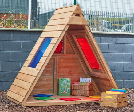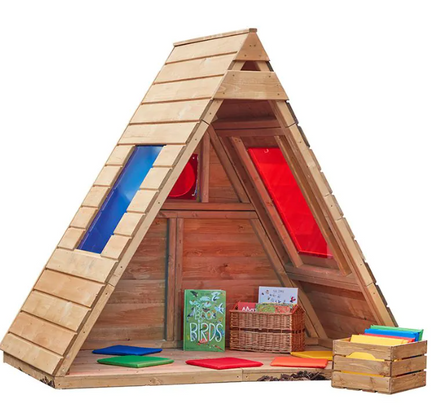 The Sky View Forest Fern is a durable A-frame playhouse that encourages mindfulness, sensory exploration, and imaginative play while promoting emotional well-being and fostering creativity. Made from sturdy wood, it seamlessly integrates into any outdoor environment, providing limitless opportunities for both play and learning.