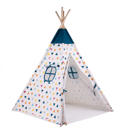 Equip your child's nursery or bedroom with this Teepee Tent, complete with curtains. It offers the perfect hideaway for playing or cozying up with a book. Easy to assemble, the wooden poles interlock smoothly. Sewn pockets at the bottom secure the poles without the need for plastic, ensuring safety for children 18 months and older.